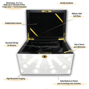 SIZING & CAPACITY INFORMATION: Sized with purpose, each Cremation Urn Memento Collection Chest is 9.5 W x 6 H x 7 W, (inches), giving a generous interior capacity of 330 cubic inches (1 cubic inch equals to 1lbs pre-cremation). This allows room to add not only your loved one’s remains, but important mementos for safe storage such as a wallet, passport, small journal, rings, coins, badges, pins, perfume, or other small tokens you would like to keep close.