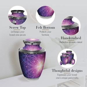 Our Seed of Life Geometric Cremation Urn is a sacred and symbolic tribute to your loved one. The Seed of Life pattern is a universal symbol of blessing and protection passed through generations; it contains the secret of the seven days of the creation. Each cremation urn is handmade to perfection by an ancient process called sand casting. Handcrafting provides each urn with its own unique variation in color, finish and texture -- so no two urns are exactly alike. Truly, a one-of-a-kind urn to cherish your loved one. The urn has a screw-top lid for easy handling and secure display. It is ideal for home, columbarium, scattering, or burial. This cremation urn is made of solid brass and is constructed to last without tarnishing. (Note: 1lbs weight prior to cremation equals to 1 cubic inch after cremation). Ships with a black velvet gift bag or box.