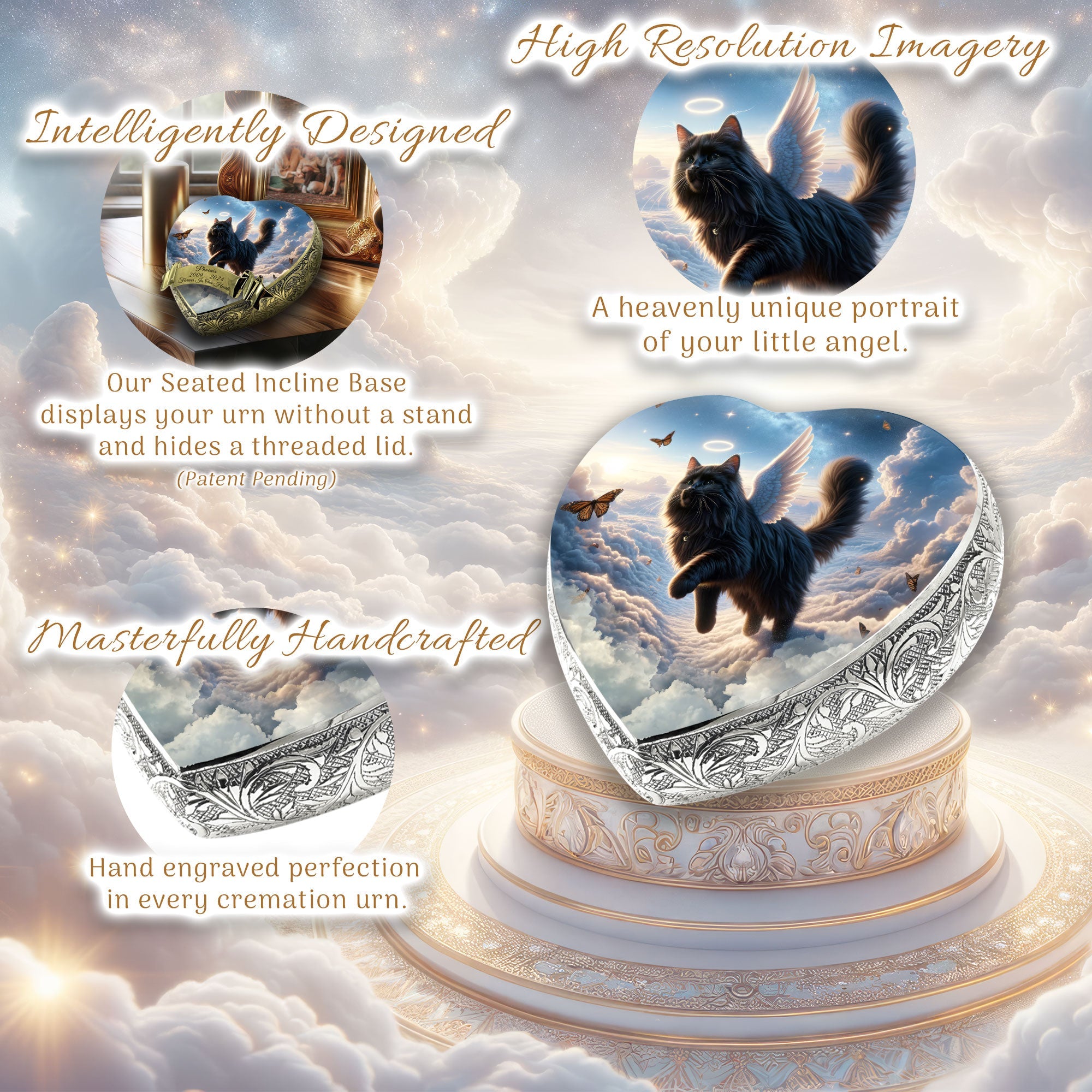 Heavenly Craftsmanship : Each urn features an elegantly hand-engraved design along its sides, adding a touch of elegance. At the center, a heavenly portrait of your beloved pet is delicately etched, capturing their essence and immortalizing their spirit.