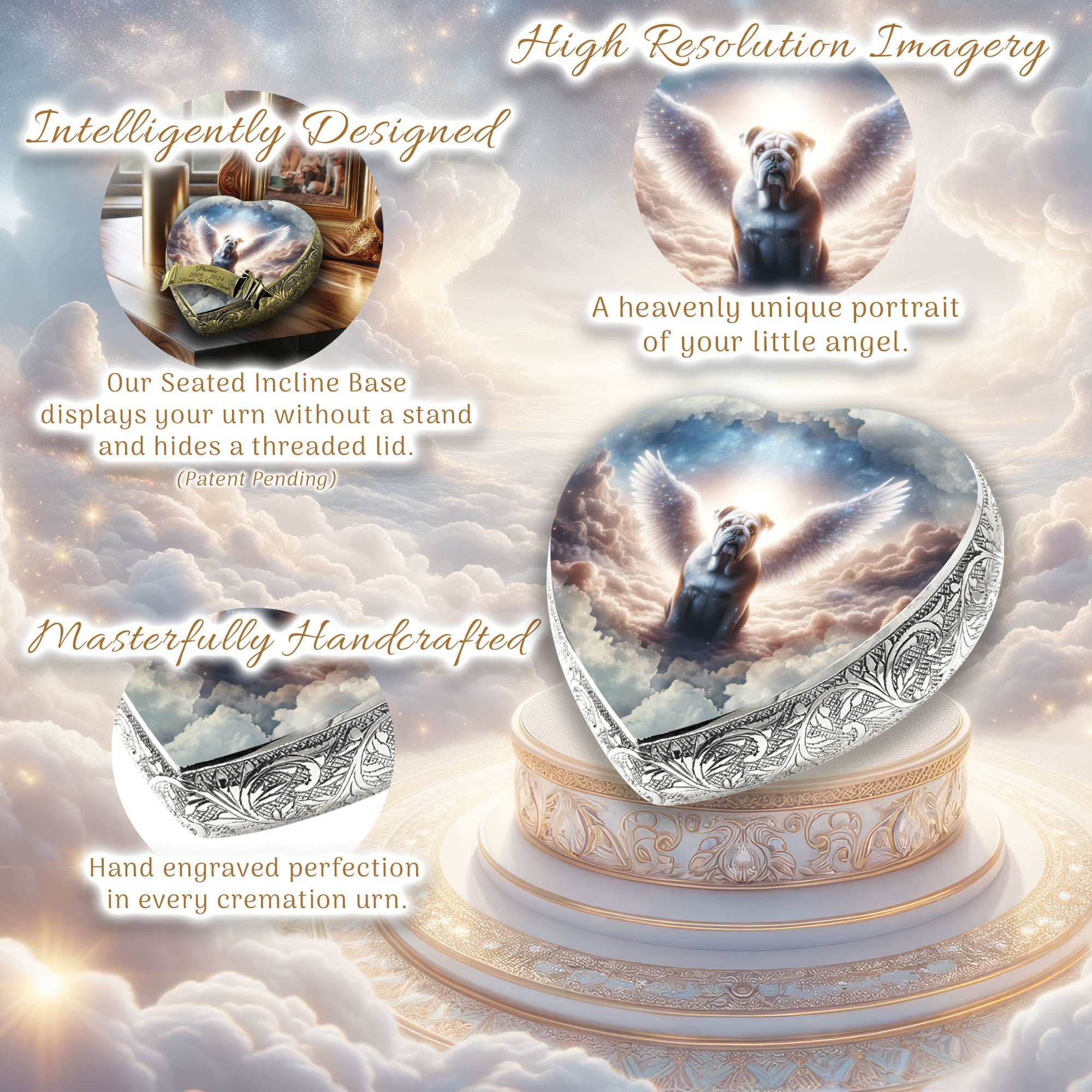 Heavenly Craftsmanship : Each urn features an elegantly hand-engraved design along its sides, adding a touch of elegance. At the center, a heavenly portrait of your beloved pet is delicately etched, capturing their essence and immortalizing their spirit.