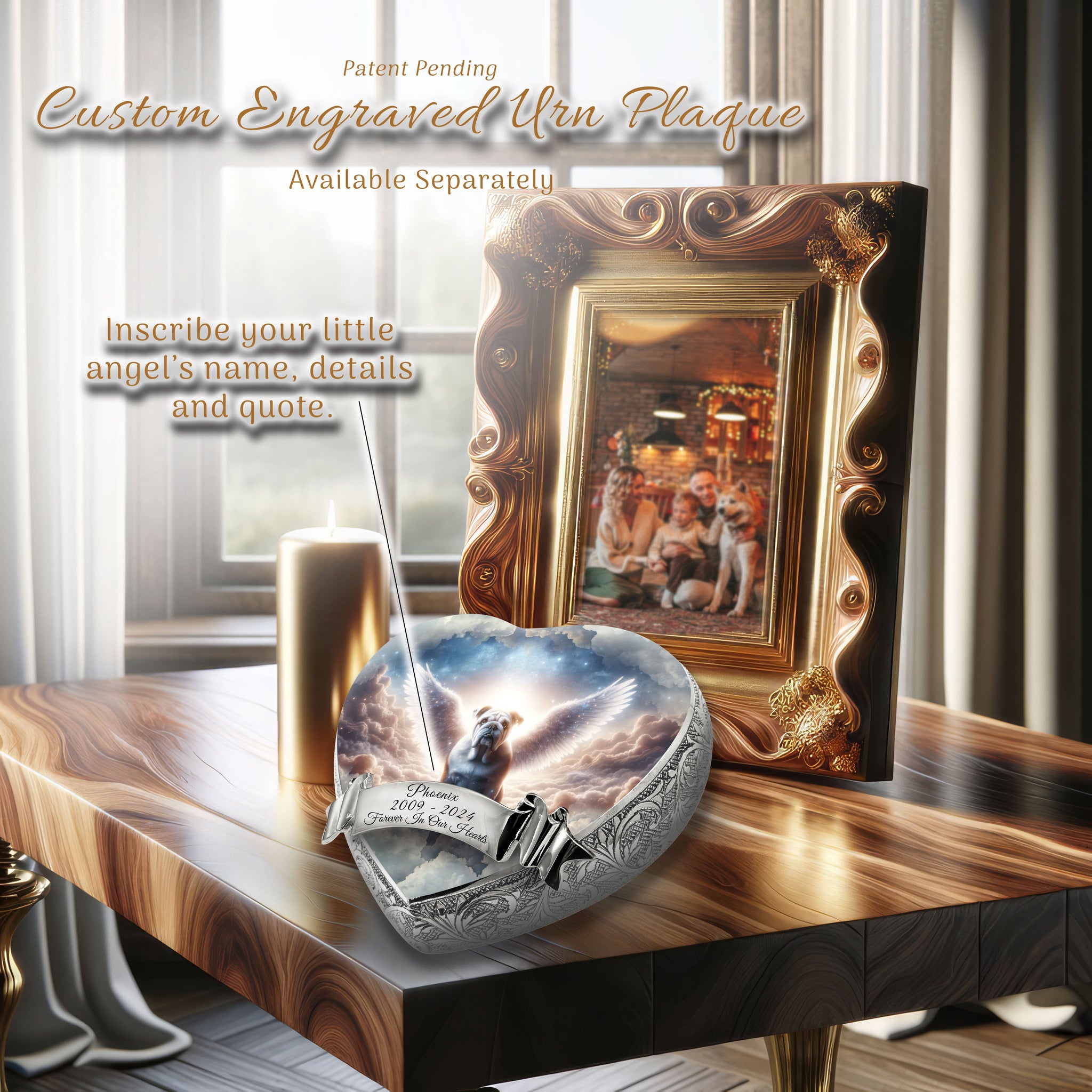 Innovative Display : Designed for elegance and convenience, this patent pending pet urn stands at a seated angle, showcasing it's photo and engravings beautifully. This unique feature allows for prominent display without the need for an additional stand, ensuring your pet's memory is always in a place of honor.