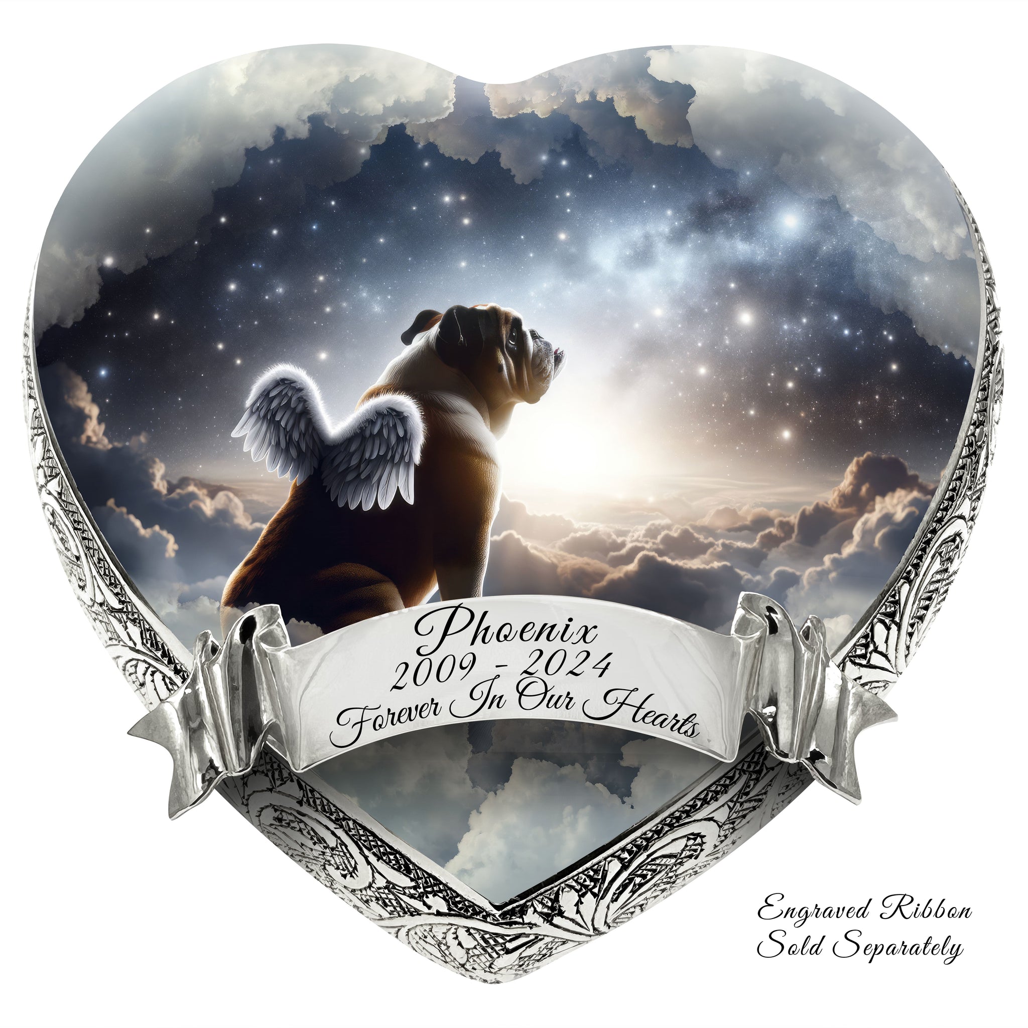 Heavenly Craftsmanship : Each urn features an elegantly hand-engraved design along its sides, adding a touch of elegance. At the center, a heavenly portrait of your beloved pet is delicately etched, capturing their essence and immortalizing their spirit.