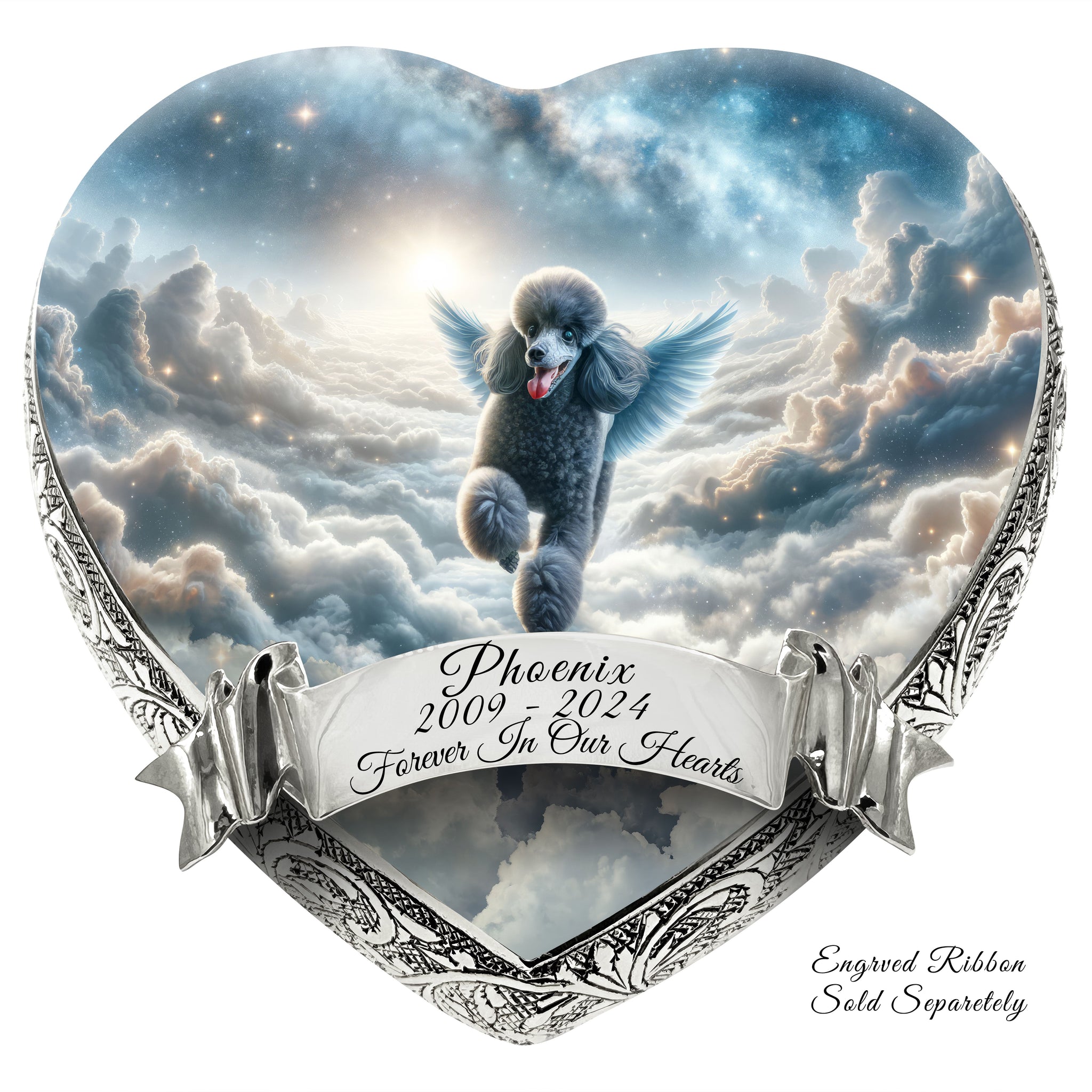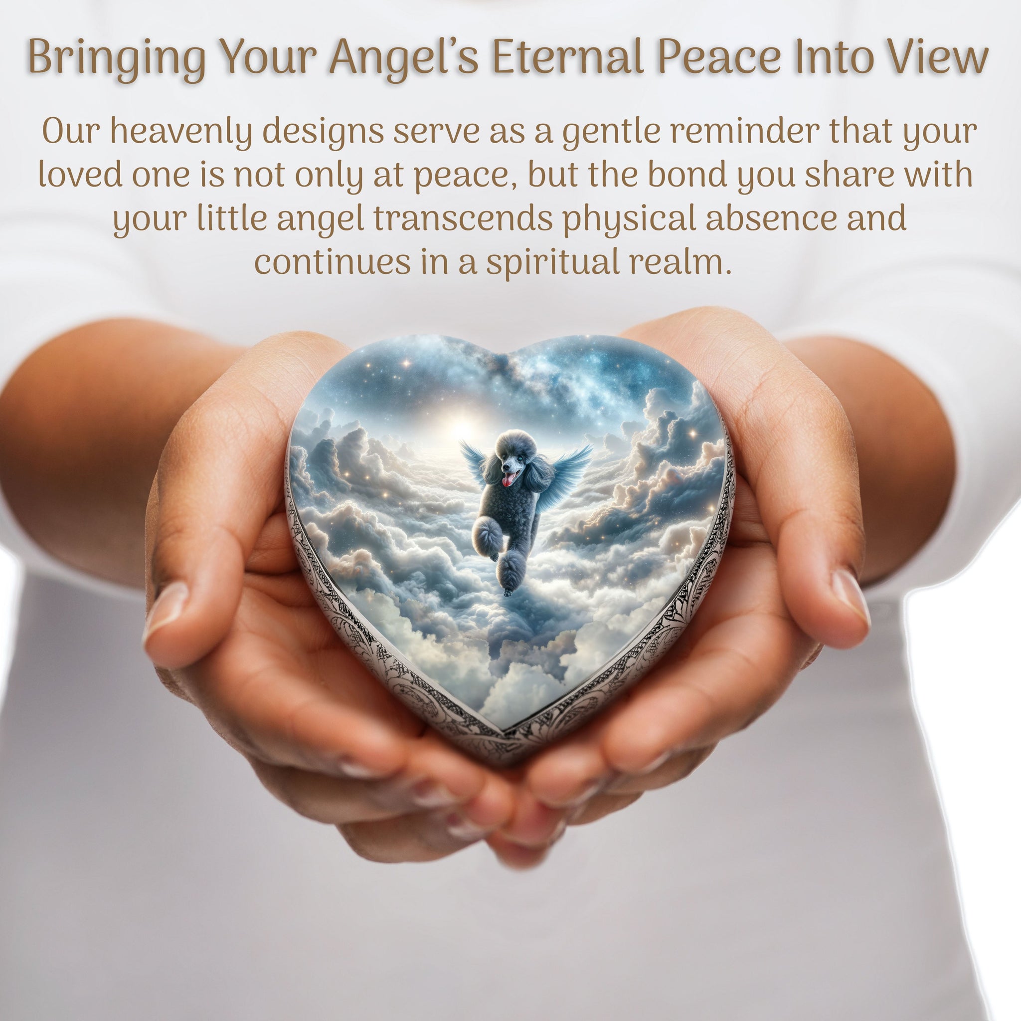 Heavenly Craftsmanship : Each urn features an elegantly hand-engraved design along its sides, adding a touch of elegance. At the center, a heavenly portrait of your beloved pet is delicately etched, capturing their essence and immortalizing their spirit.