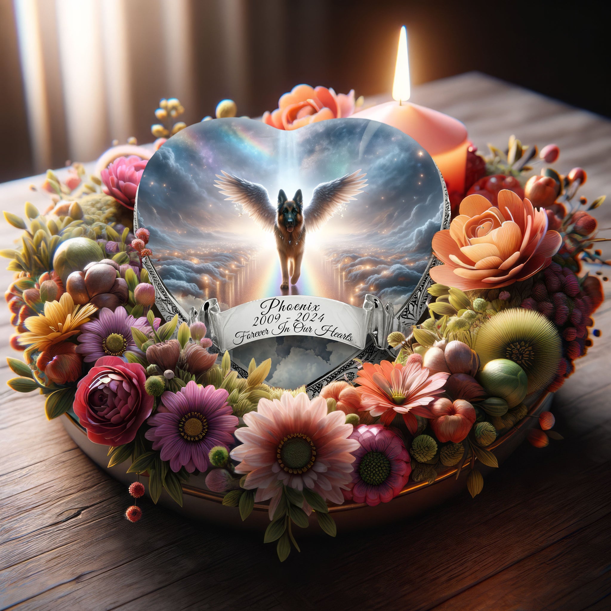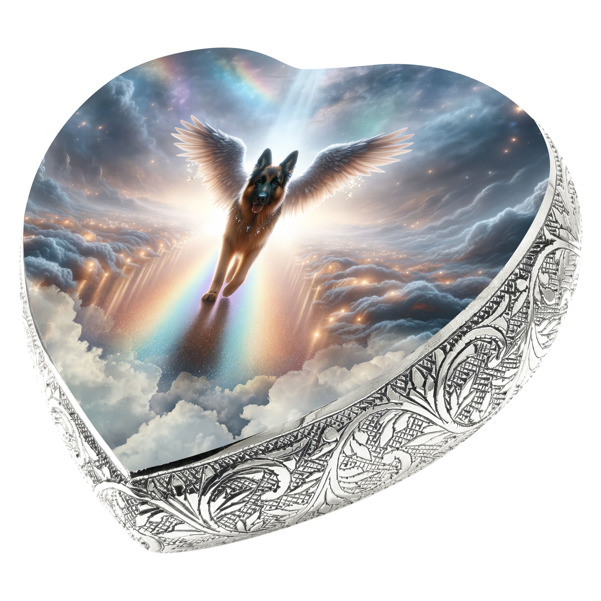 Some bonds can't be replaced, and saying goodbye to your German Shepherd is one of the hardest things you'll ever face. Their loyalty, their protection, and their endless love leave behind memories that never fade. This heart shaped rainbow bridge German shepherd urn was created to help you honor those memories while keeping their presence close to your heart.