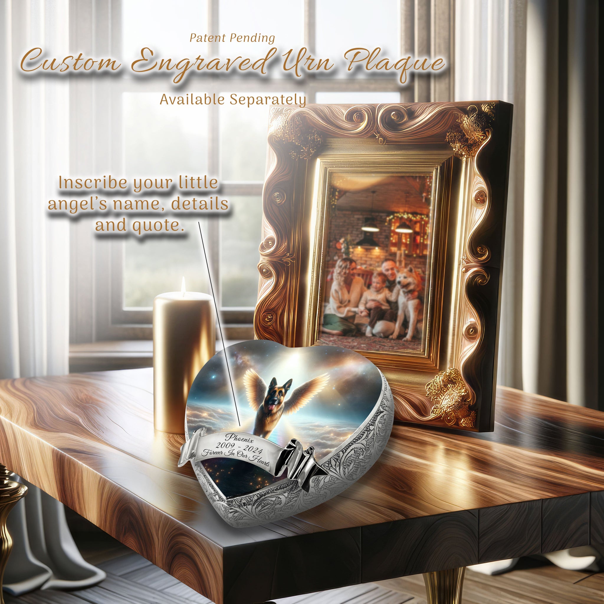 Innovative Display : Designed for elegance and convenience, this patent pending pet urn stands at a seated angle, showcasing it's photo and engravings beautifully. This unique feature allows for prominent display without the need for an additional stand, ensuring your pet's memory is always in a place of honor.