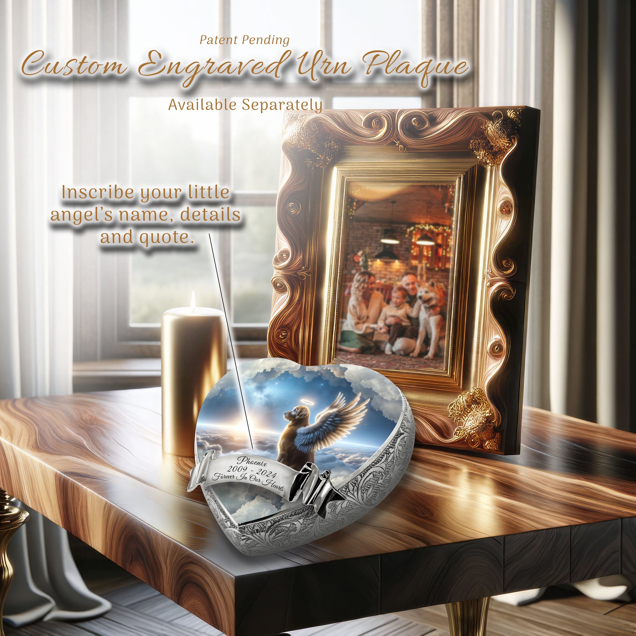 Innovative Display : Designed for elegance and convenience, this patent pending pet urn stands at a seated angle, showcasing it's photo and engravings beautifully. This unique feature allows for prominent display without the need for an additional stand, ensuring your pet's memory is always in a place of honor.