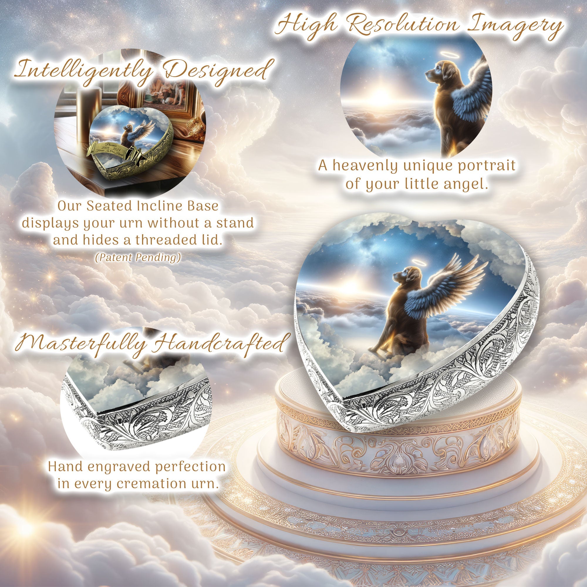 Heavenly Craftsmanship : Each urn features an elegantly hand-engraved design along its sides, adding a touch of elegance. At the center, a heavenly portrait of your beloved pet is delicately etched, capturing their essence and immortalizing their spirit.