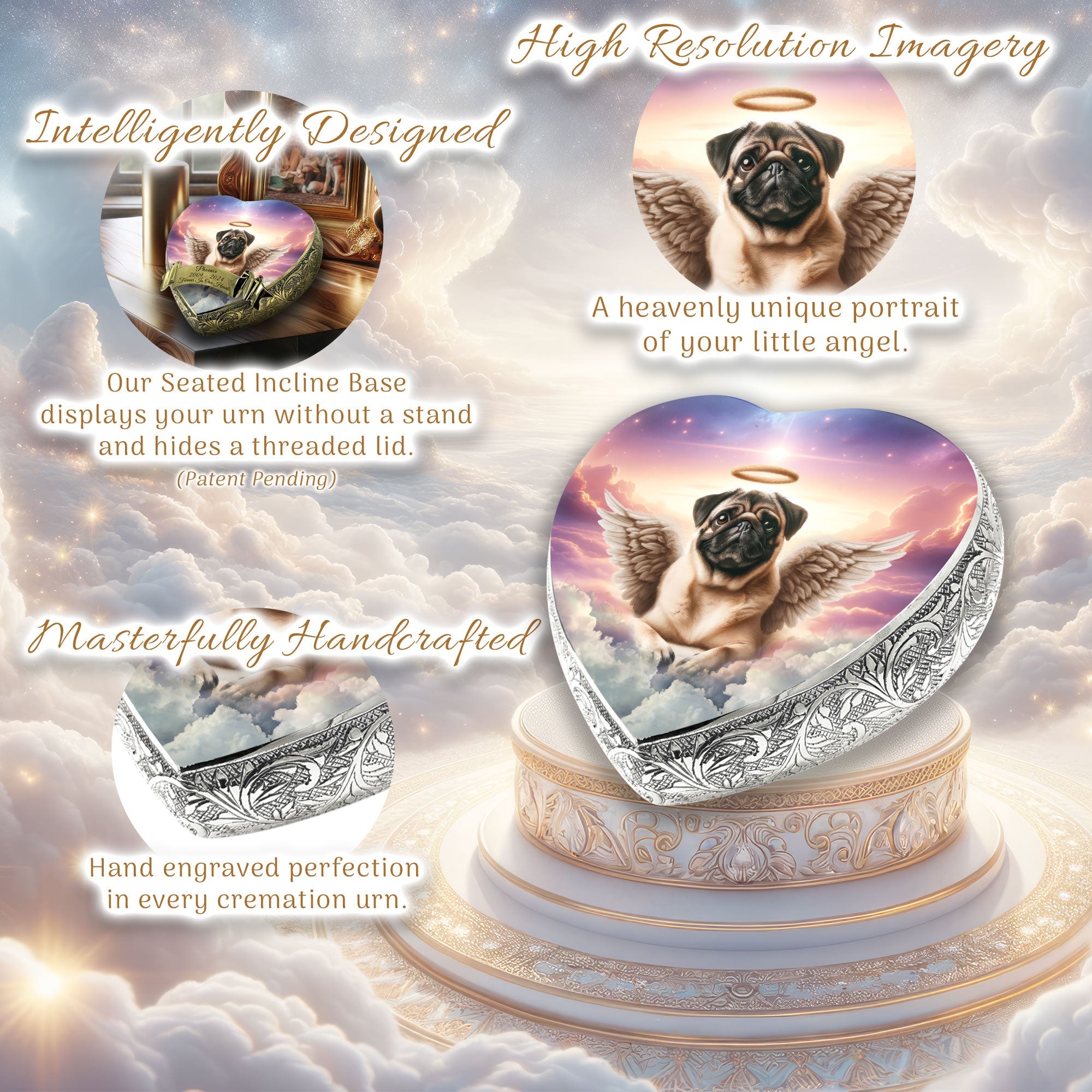 Heavenly Craftsmanship : Each urn features an elegantly hand-engraved design along its sides, adding a touch of elegance. At the center, a heavenly portrait of your beloved pet is delicately etched, capturing their essence and immortalizing their spirit.