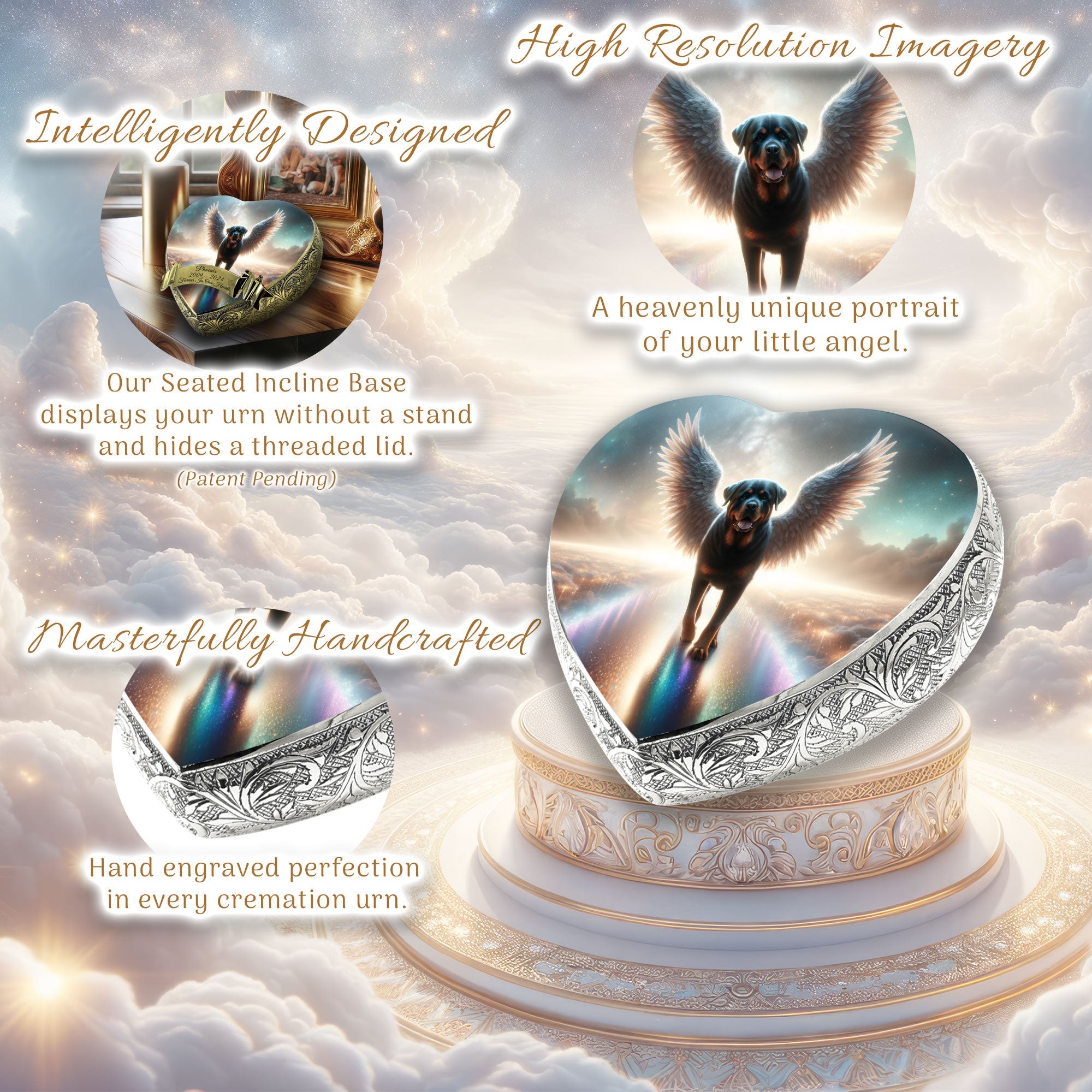 Heavenly Craftsmanship : Each urn features an elegantly hand-engraved design along its sides, adding a touch of elegance. At the center, a heavenly portrait of your beloved pet is delicately etched, capturing their essence and immortalizing their spirit.