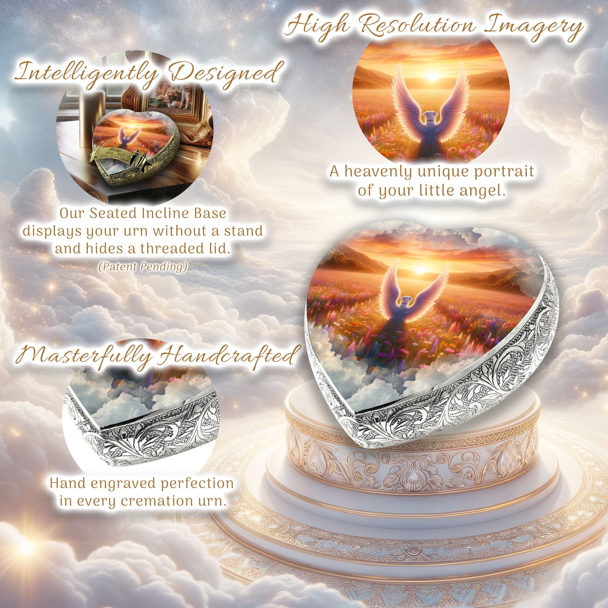 Heavenly Craftsmanship : Each urn features an elegantly hand-engraved design along its sides, adding a touch of elegance. At the center, a heavenly portrait of your beloved pet is delicately etched, capturing their essence and immortalizing their spirit.
