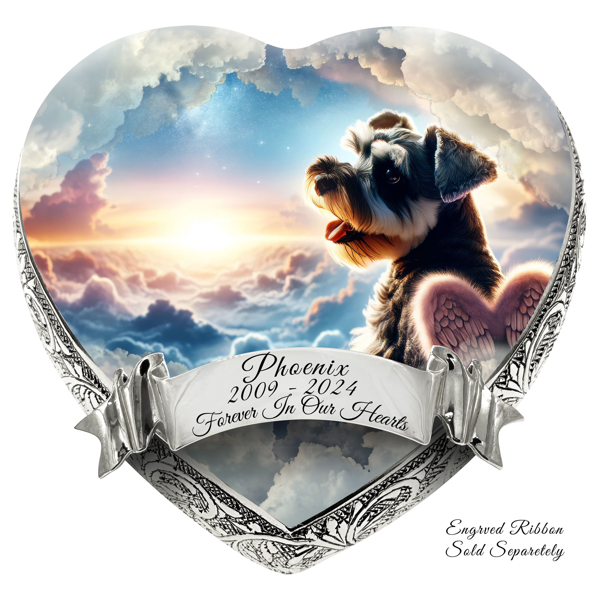 Heavenly Craftsmanship : Each urn features an elegantly hand-engraved design along its sides, adding a touch of elegance. At the center, a heavenly portrait of your beloved pet is delicately etched, capturing their essence and immortalizing their spirit.