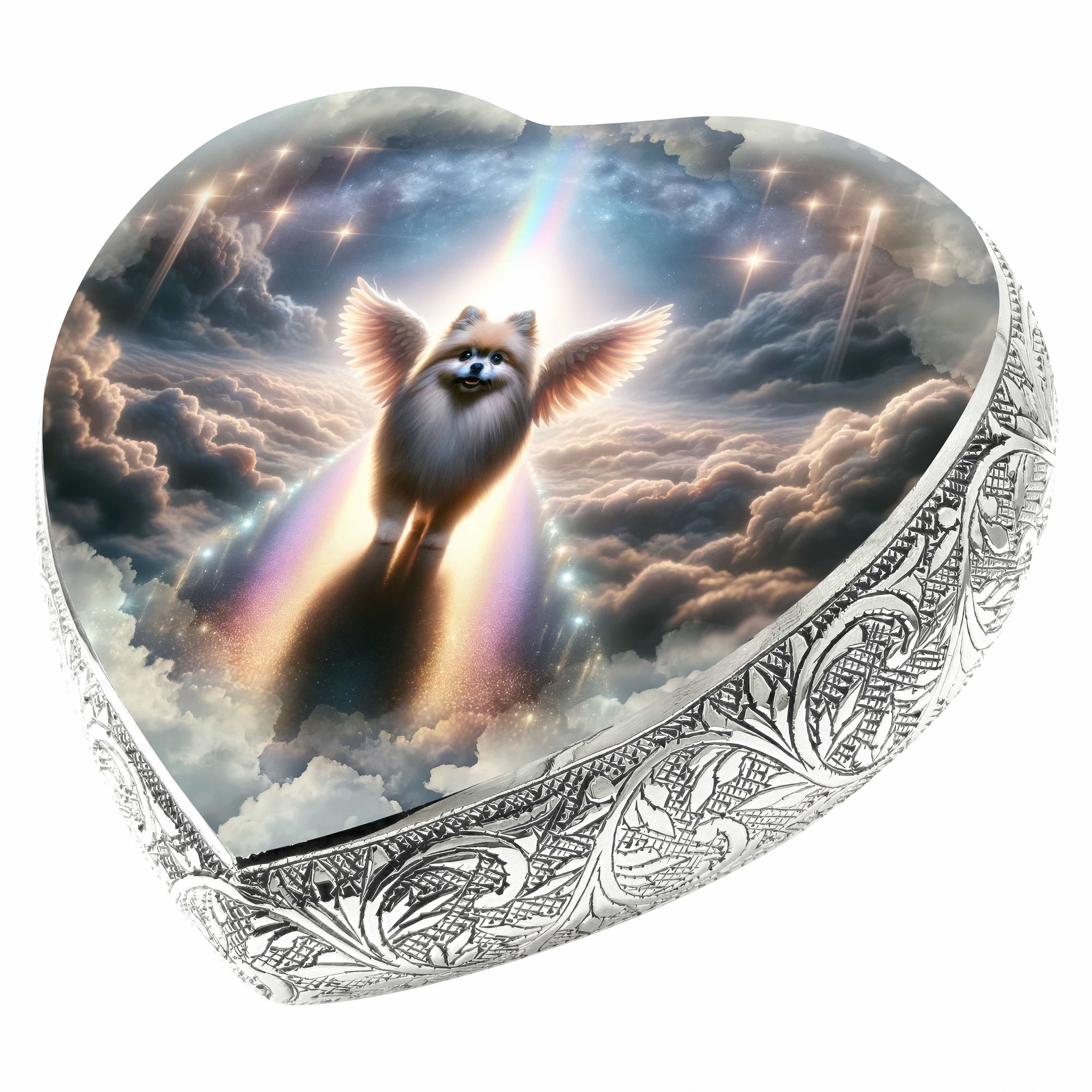 Honor your pet's journey over the Rainbow Bridge with the "Little Angels Heart Urn," a symbol of love, memory, and the everlasting paw prints they left on your heart.