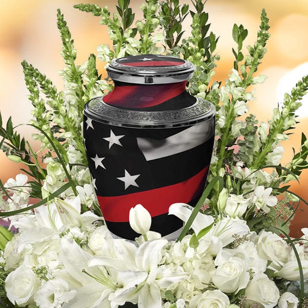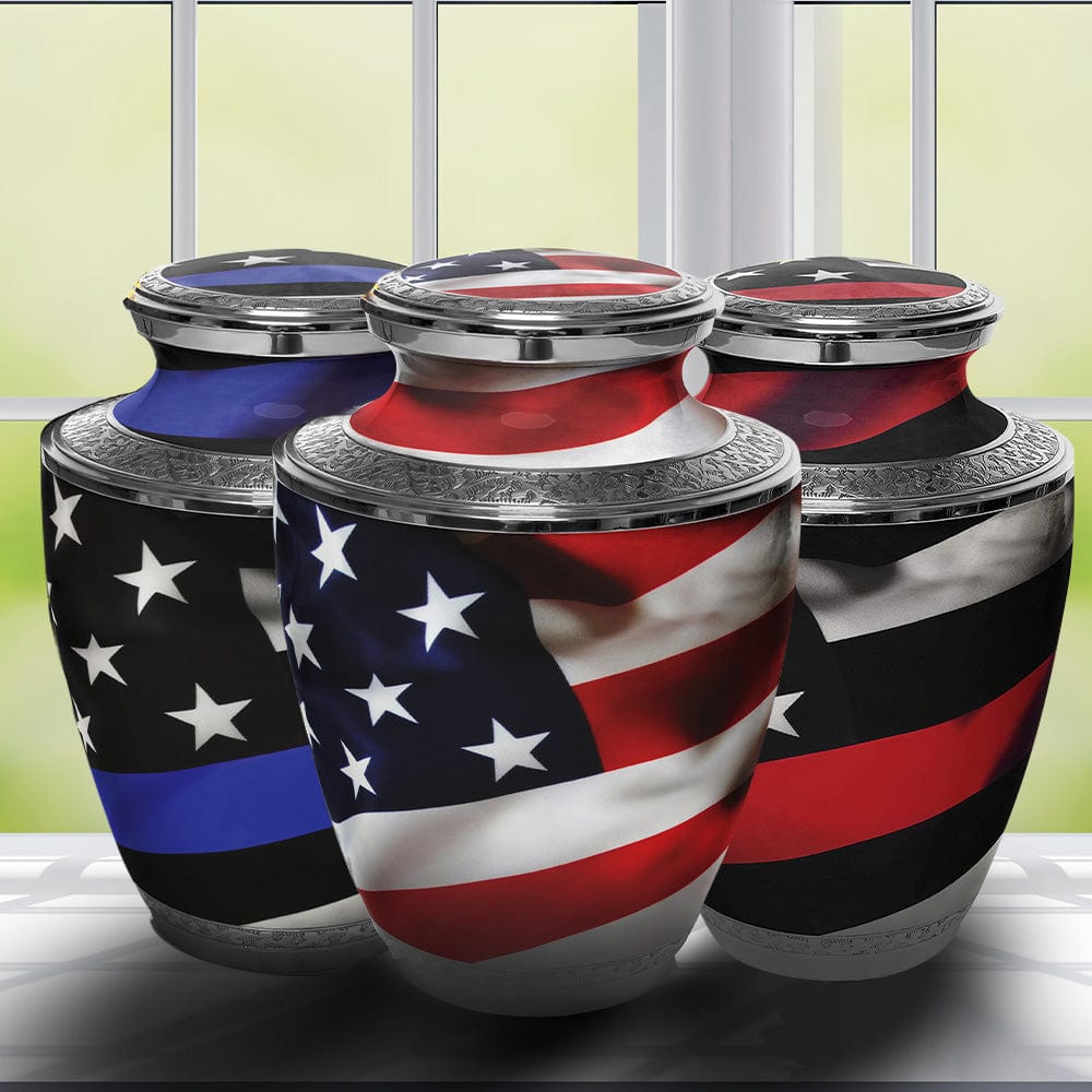 Our metal American Flag cremation urns and burial urns for cremated remains are designed to warm your heart with memories. These urns for cremation and urns for human ashes come in Large, XL and small serve as a beautiful works of art within your home. The American Flag Cremation Urns for human ashes and memorial urn is a patriotic tribute to your loved one. Bold and commemorative, it features an image of the American flag.