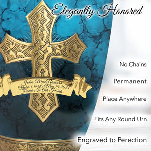 Our metal cremation urns and cross burial urns for cremated remains are designed to warm your heart with memories. These urns for cremation and urns for human ashes come in Large, XL and small serve as a beautiful works of art within your home. Our Religious Cross Cremation Urns for human ashes and memorial urn is a bold & religious tribute for your loved one, featuring a gold hand engraved Catholic/Christian cross centered in rays.