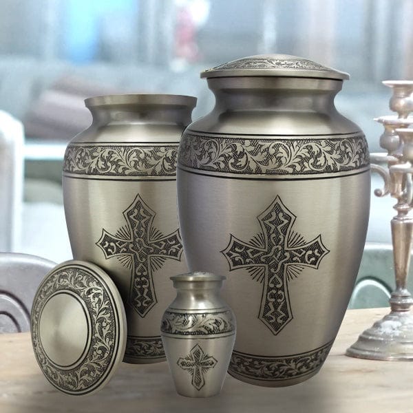 As Unique as the Lives the Symbolize, our cross urns for cremation ashes are built to last. We only use the highest quality materials in each cremation urn. Our funeral urns for human ashes are crafted with aerospace grade aluminum, are carefully hand engraved for an elegant detailed finish, and and have threaded lids that require firm counter-clockwise twisting to ensure a secure enclosure. Each large and extra large urn comes with a velvet gift bag for safe keeping during transport. Our small keepsake urns are made of 100% brass and come with a velvet gift box to serve as thoughtful gifts for family members that would like a heartfelt reminder of a loved one. Please note: We unfortunately do not provide engraving on our urns. Most designs do not have enough blank free space to accommodate this feature.