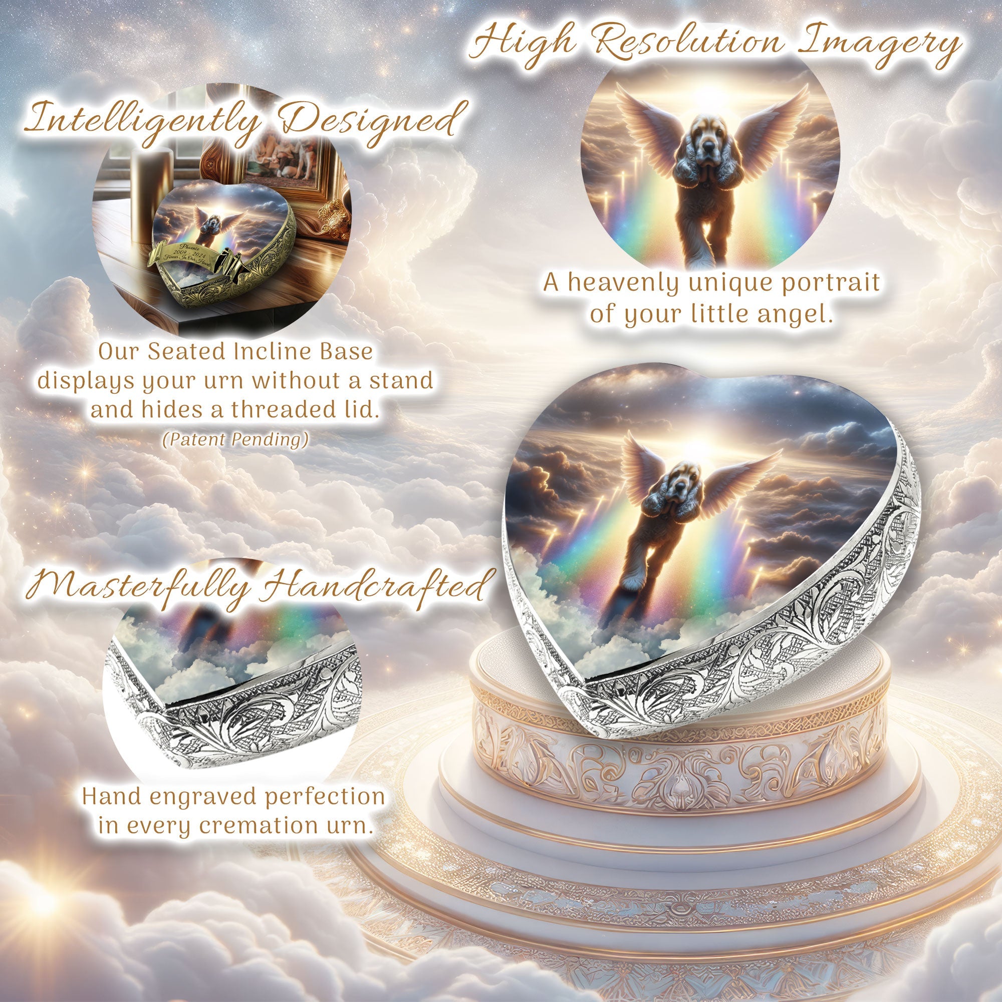 Heavenly Craftsmanship : Each urn features an elegantly hand-engraved design along its sides, adding a touch of elegance. At the center, a heavenly portrait of your beloved pet is delicately etched, capturing their essence and immortalizing their spirit.