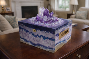 Created for those drawn to the beauty and spiritual resonance of natural crystals, this memorial chest is a meaningful tribute and an extraordinary work of art. Designed as the perfect gift for a divine crystal lover, it blends remembrance with reverence, offering a space where memory, energy, and love are thoughtfully preserved.
