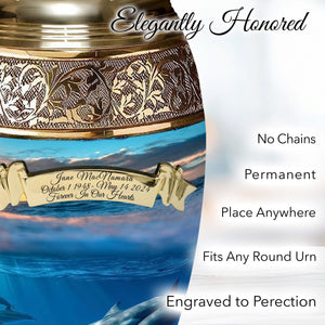 Our metal dolphin cremation urns and burial urns for cremated remains are designed to warm your heart with memories. These urns for cremation and urns for human ashes come in Large, XL and small serve as a beautiful works of art within your home. Our Divine Dolphin Cremation Urns for human ashes and memorial urn is a scenic & freeing tribute for your loved one, featuring sets of dolphins swimming under the ocean's surface.