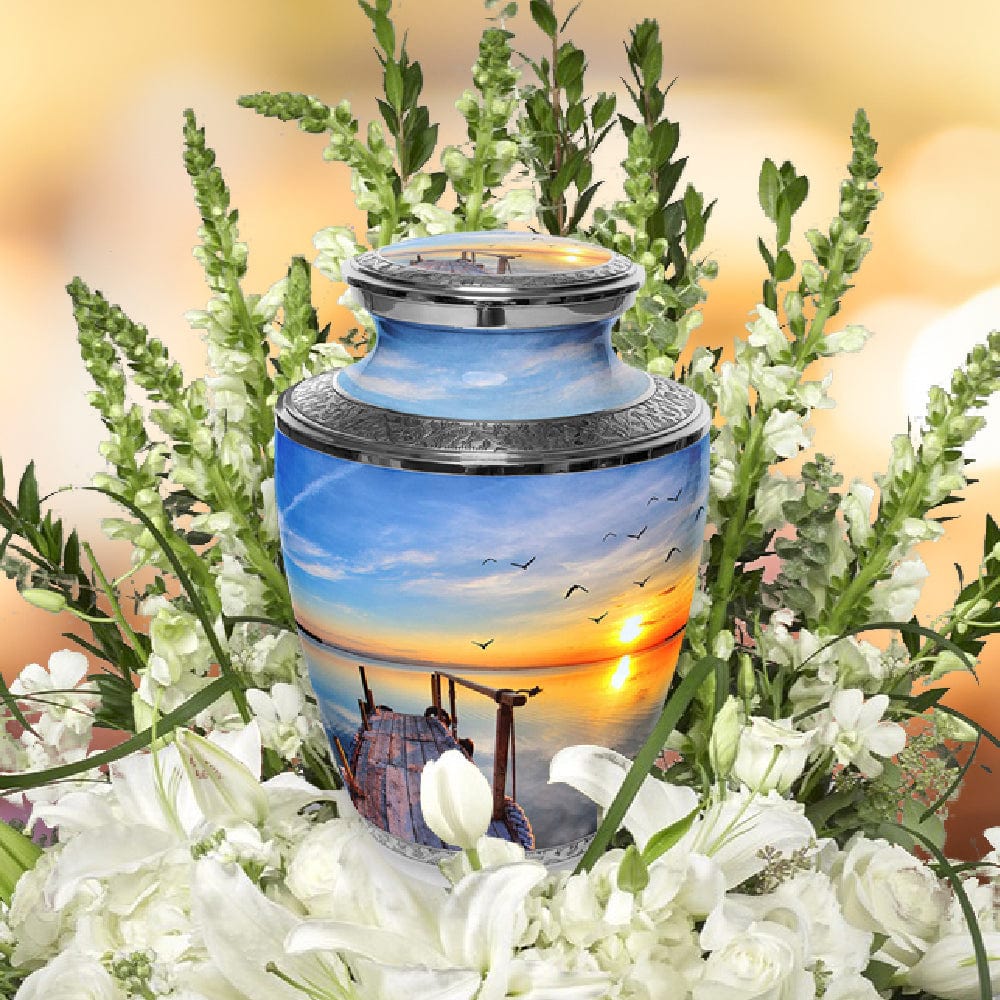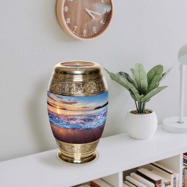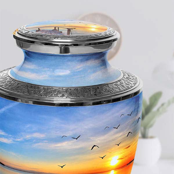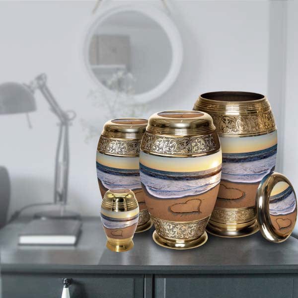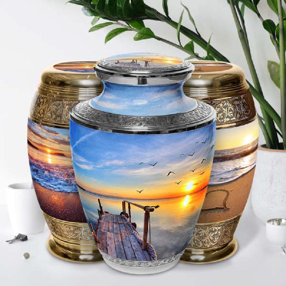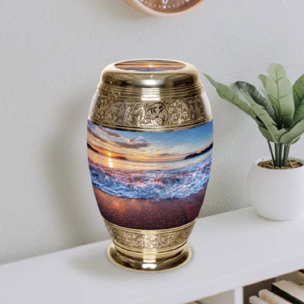 Our metal cremation urns and burial urns for cremated remains are designed to warm your heart with memories. These urns for cremation and urns for human ashes come in Large, XL and small serve as a beautiful works of art within your home. Our Endless Summer Cremation Urns for human ashes and memorial urn is a calm and freeing tribute to your loved one. Scenic and peaceful, it features a beautiful sunset with a heart drawn into the sand.