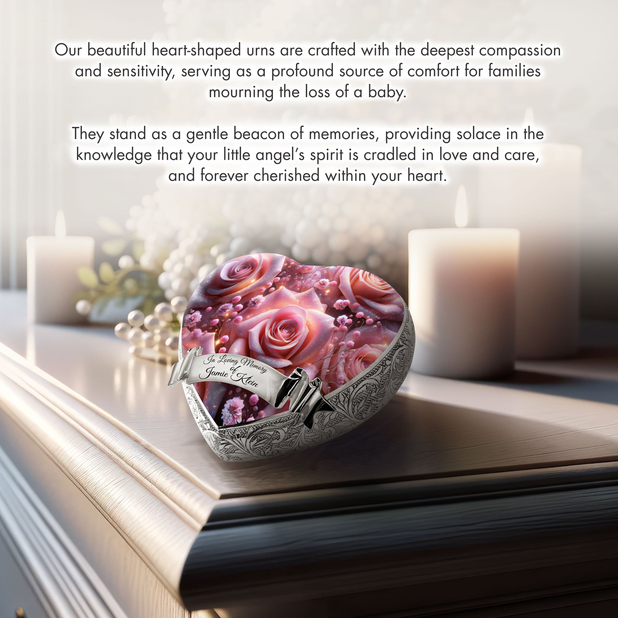 Our exquisite collection of heart-shaped baby cremation urns are a testament to our commitment to providing families with a heartfelt and dignified way to cherish the memory of their precious little ones. Each urn is meticulously handcrafted with engraved borders that add a touch of elegance and grace, symbolizing the eternal love surrounding the cherished child. The unique seated incline base not only enhances the urn's aesthetic appeal but also ensures it stands as a prominent and respectful tribute. What sets our urns apart is the stunning 4K imagery that adorns them, offering lifelike representations that capture the essence of purity and peace. This combination of bespoke craftsmanship and advanced imagery technology creates a beautiful sanctuary for your beloved baby's remains, offering a tangible representation of your love and the serene beauty of their spirit.