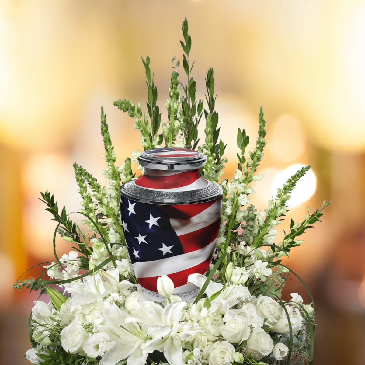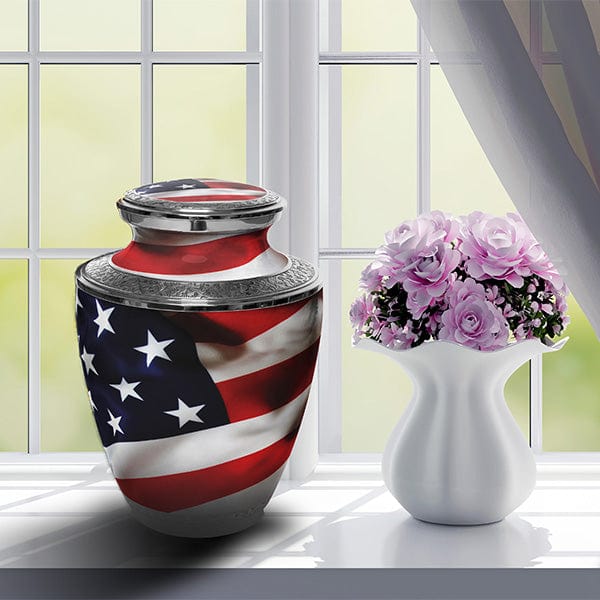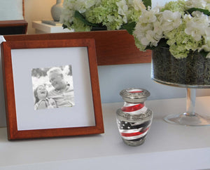 Our patriotic urns are both a respectful resting place for a loved one and a beautiful work of art for your home. Our designers are dedicated to creating urns with you in mind, allowing us to create elegant and meaningful urns that serve as a respectful resting place for your loved one and add beauty to your home. This family of cremation urns features an American flag, an American flag with a red line, or an American flag with a blue line. These are the perfect patriotic urns to celebrate the life of a loved one, especially former firefighters, police officers, and first responders.