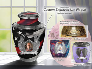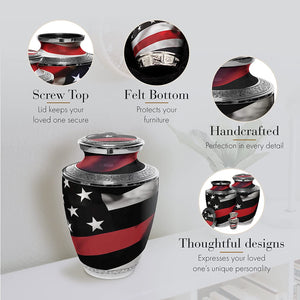 Our metal firefighter cremation urns and burial urns for cremated remains are designed to warm your heart with memories. These urns for cremation and urns for human ashes come in Large, XL and small serve as a beautiful works of art within your home. Our Red Line Firefighter Cremation Urns for human ashes and memorial urn is a patriotic tribute to your loved one. Bold and commemorative, it features an image of the Red Line Flag.