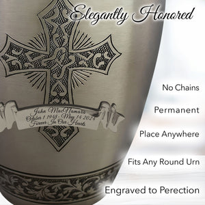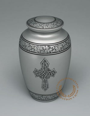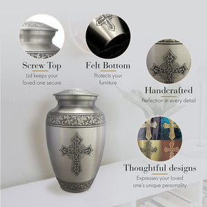 Our metal cross cremation urns and cross burial urns for cremated remains are designed to warm your heart with memories. These urns for cremation and urns for human ashes come in Large, XL and small serve as a beautiful works of art within your home. Our Religious Cross Cremation Urns for human ashes and memorial urn is a bold & religious tribute for your loved one, featuring a silver hand engraved Catholic/Christian cross centered in rays.