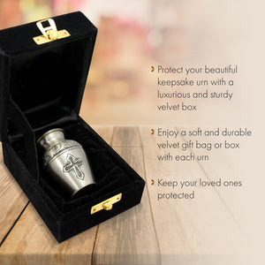 As Unique as the Lives the Symbolize, our cross urns for cremation ashes are built to last. We only use the highest quality materials in each cremation urn. Our funeral urns for human ashes are crafted with aerospace grade aluminum, are carefully hand engraved for an elegant detailed finish, and and have threaded lids that require firm counter-clockwise twisting to ensure a secure enclosure. Each large and extra large urn comes with a velvet gift bag for safe keeping during transport. Our small keepsake urns are made of 100% brass and come with a velvet gift box to serve as thoughtful gifts for family members that would like a heartfelt reminder of a loved one. Please note: We unfortunately do not provide engraving on our urns. Most designs do not have enough blank free space to accommodate this feature.