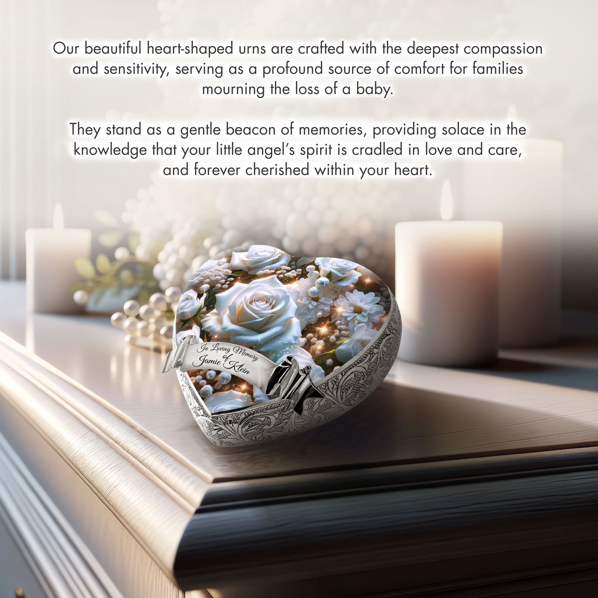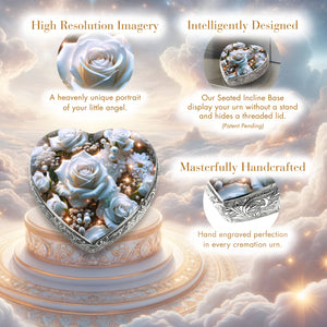 Our exquisite collection of heart-shaped baby cremation urns are a testament to our commitment to providing families with a heartfelt and dignified way to cherish the memory of their precious little ones. Each urn is meticulously handcrafted with engraved borders that add a touch of elegance and grace, symbolizing the eternal love surrounding the cherished child. The unique seated incline base not only enhances the urn's aesthetic appeal but also ensures it stands as a prominent and respectful tribute. What sets our urns apart is the stunning 4K imagery that adorns them, offering lifelike representations that capture the essence of purity and peace. This combination of bespoke craftsmanship and advanced imagery technology creates a beautiful sanctuary for your beloved baby's remains, offering a tangible representation of your love and the serene beauty of their spirit.